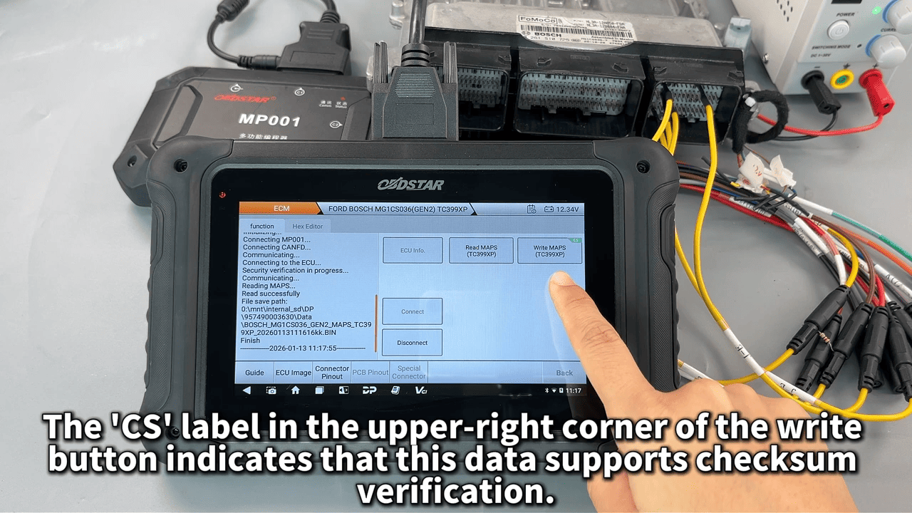 When writing data to the FORD MG1CS036 ECM, the CS checksum label indicates checksum verification support, ensuring data integrity and programming safety.