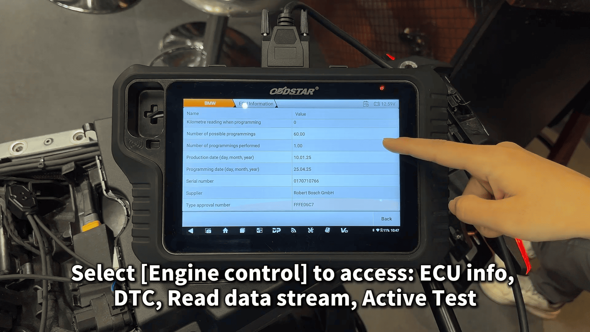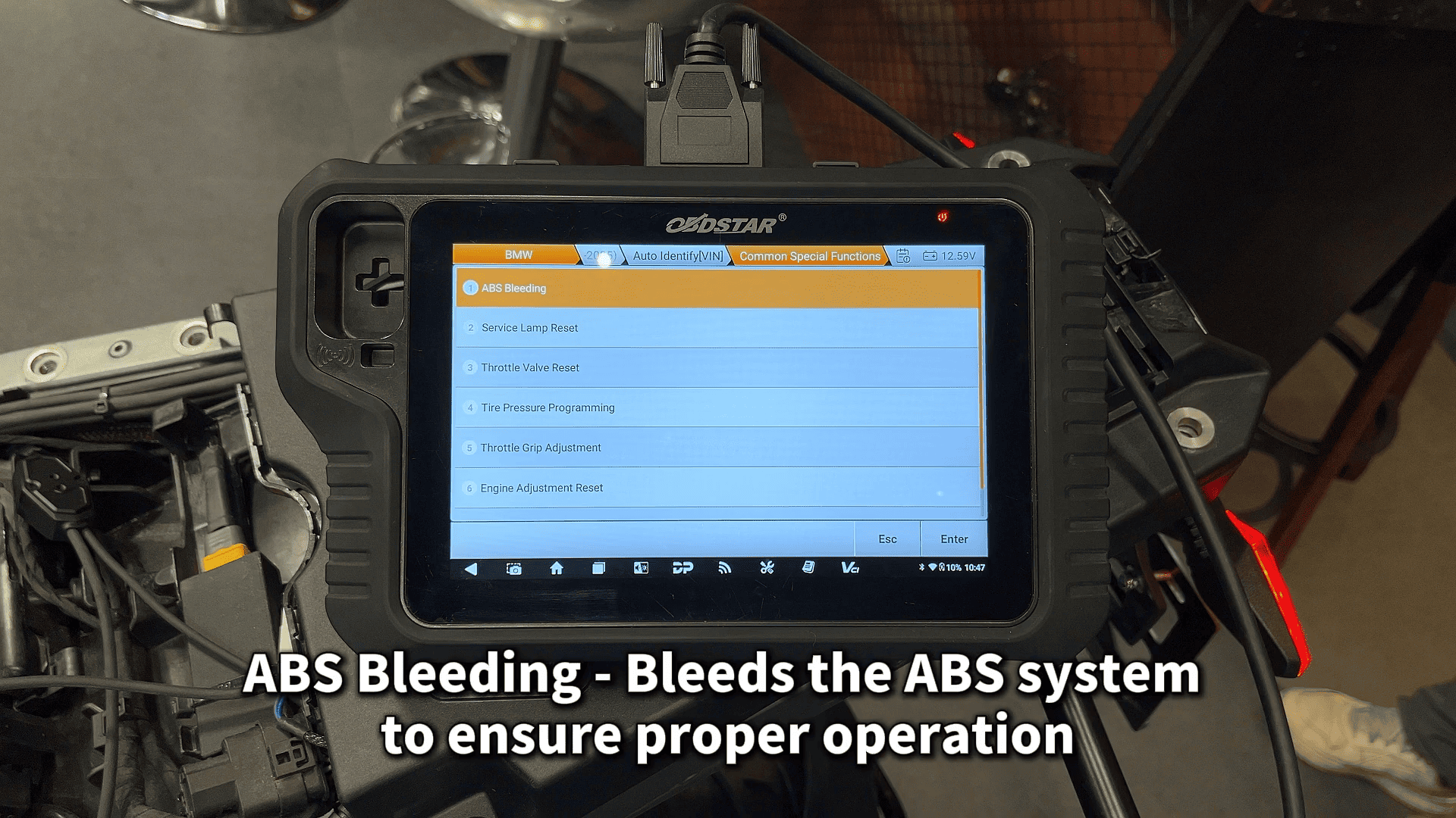 Key features include Service Lamp Reset, ABS Bleeding, Throttle Valve Reset, Tire Pressure Programming, and Mileage Writing—all essential for routine maintenance or after component replacement. When entering the engine system, MOTOMASTER provides ECU information, DTC reading, data stream monitoring, and active tests.