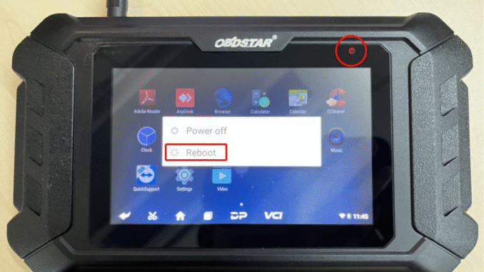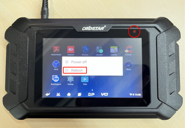 Confirm the power adapter is connected and the LED is on. Long-press the power button and select Restart.