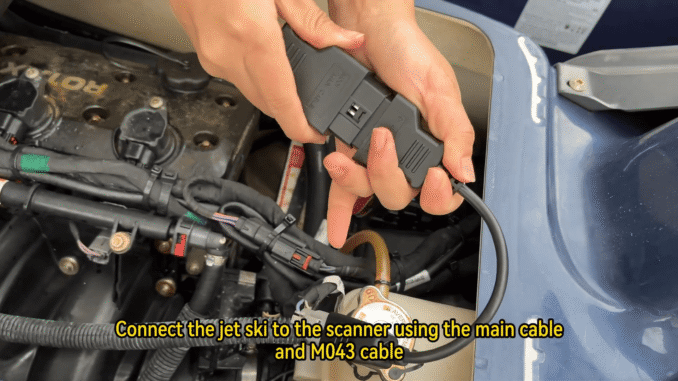 Start by connecting the OBDSTAR MarineMaster to the jet-ski using the main cable and M043 dedicated cable. Ensure all connections are secure before proceeding.