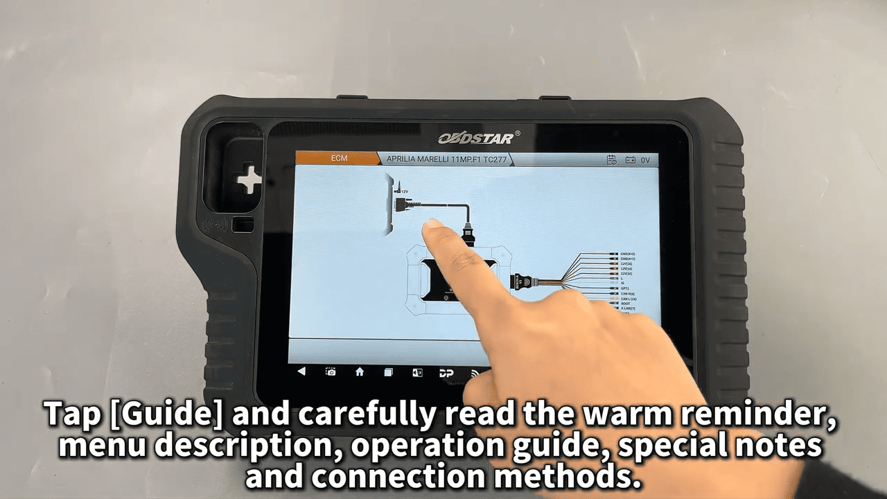 Tap [Guide] and carefully read the warm reminder, menu description, operation guide, special notes and connection methods